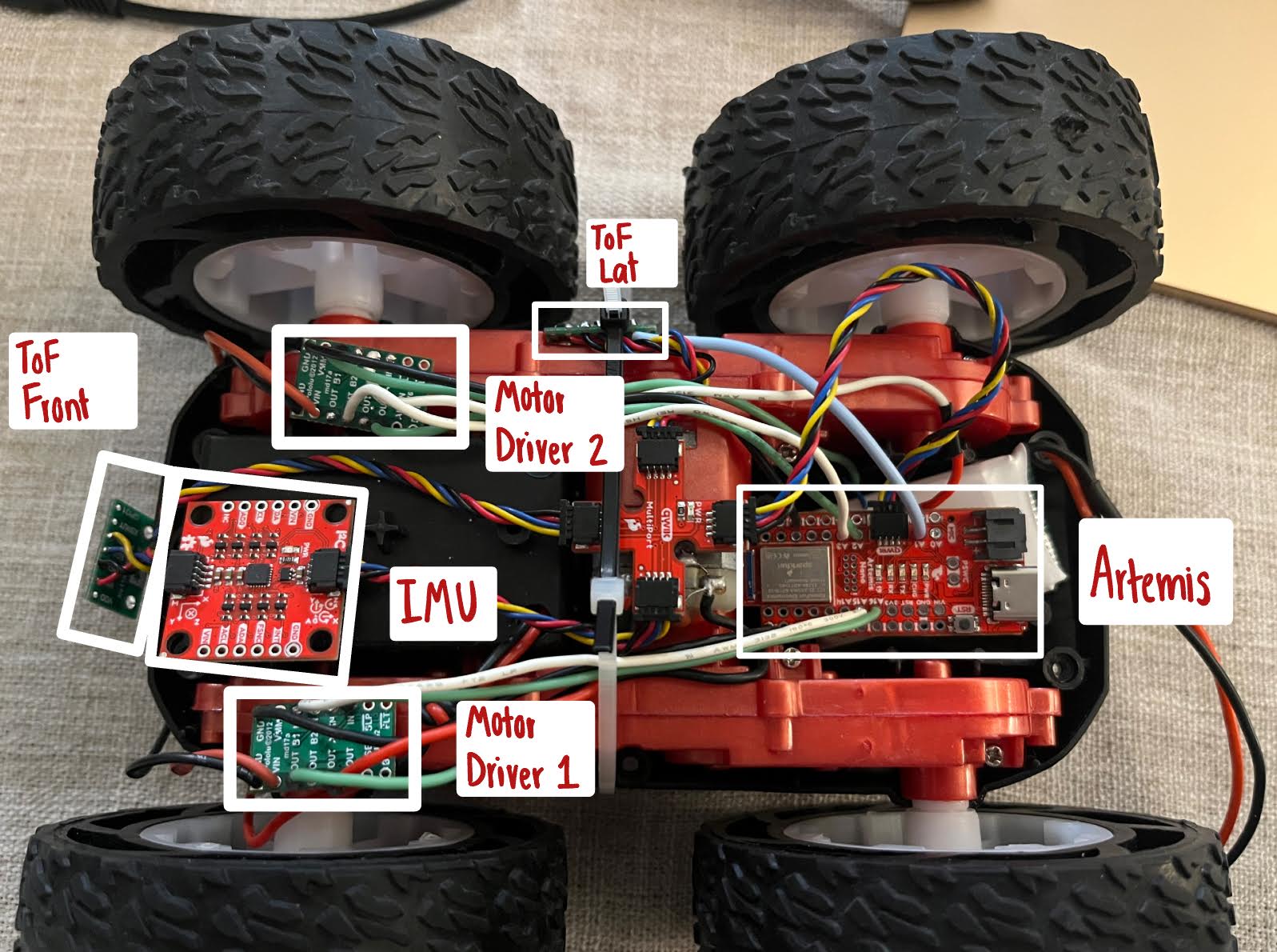 As for the wiring, I attempted to cut the wires to lengths that were as short as possible to eliminate EMI, however, long enough to have slack such that connections remain intact. I decided to follow common practice, making sure that wires that supply voltage are red, and all grounding wires are black. The remaining colors I chose personally, and tried to remain consistent. To further reduce EMI between wires and components, I decided to place the Artemis at the far back, away from the motor drivers' battery, twisted wires pairs, and made sure that there were no unintentional wire loops.