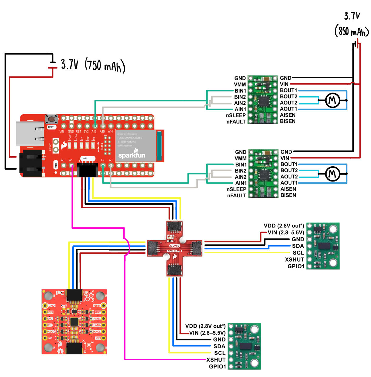 In this lab, we wire up and run tests on our motor drivers. The following diagram shows how I decided to wire all the devices to the Artemis, including the batteries for the motor drivers and the Artemis itself.