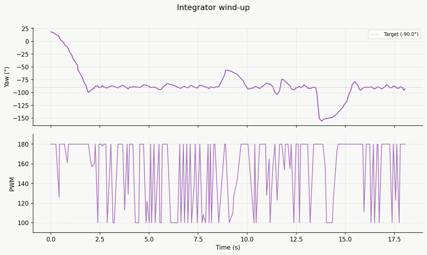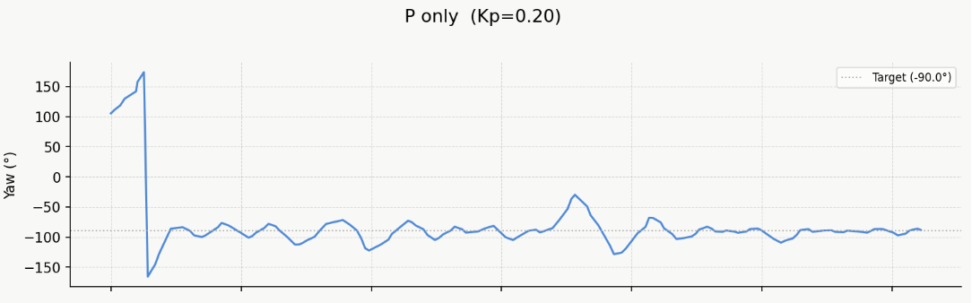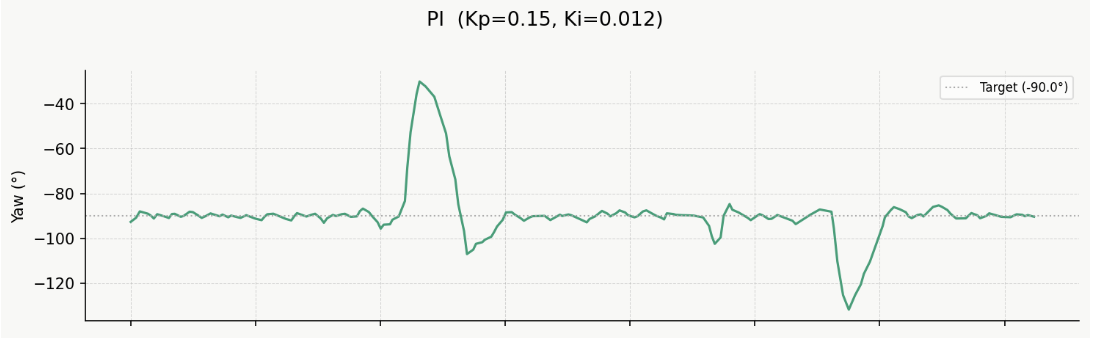 You can see how the system still oscillates about the target value, but never stays stable. For this reason, I decided to introduce derivative control.