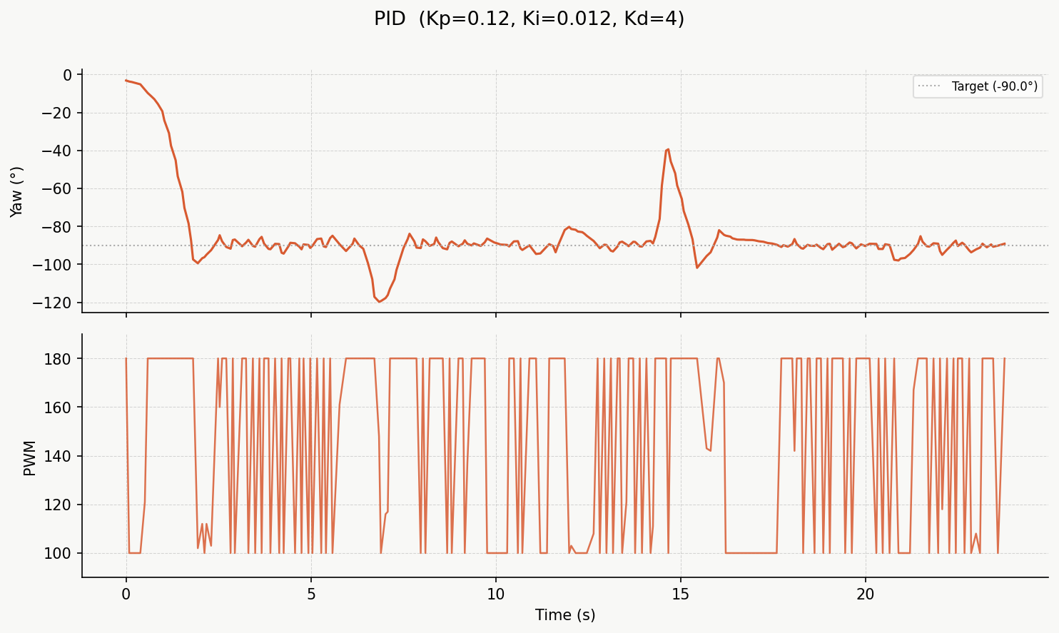 To begin, I started implementing proportional control the same way that I did for Lab 5, however, this lab required a more empirical approach to reach the final value. I started off determining the Kp value just as I did for Lab 5 using the following equation: $$PWM = K_p \cdot e(t), \quad e(t) = \text{target} - \text{yaw}$$ where the error is wrapped to ±180°. I selected a target angle of 90 degrees, therefore I estimated that the maximum error at the start of a turn would be around 90° and selecting Kp such that Kp × 90 fell near the middle of the usable PWM range (100–180). This gave a Kp of ~2. I then tuned downward empirically from there, as originally, the car would vastly overshoot and undershoot, leading me to settle on Kp = 0.2.